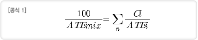 - (b)가산식 적용 : 혼합물의 구성성분 중에 독성 구분(급성 1 또는 만성 1, 2, 3, 4)이 아닌 적절한 시험 데이터가 있는 성분이 두 종류 이상인 경우에는, 시험 데이터의 성격에 따라 [공식 3] 또는 [공식 4]의 방법에 따라 이러한 성분의 조합에 대한 독성치를 계산한다. 이 독성 계산치를 사용하여 단일물질의 수생환경위해성 분류기준 표에 따라 조합된 성분에 대한 독성 구분을 정하며, 그 다음에 이것을 (c)의 합산방법에 적용한다. 다만, 혼합물의 만성독성 구분을 위해서는 만성독성으로 분류되지 않는 성분은 가산식에 적용하지 않는다.