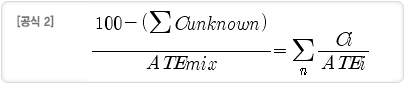 - 나) 혼합물 중에서 모든 고독성 성분에 대해서 독성 데이터를 입수할 수 있고, 그 밖의 모든 성분에 대해서는 독성이 낮거나 그혼합물의 유해성에 영향을 주지 않는 경우, 아래 (b)의 가산식을 사용한다.
