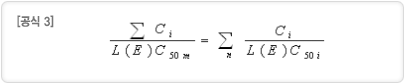 이 공식에서 Ci는 성분 i의 농도(중량 백분율)를, L(E)C50i 는 성분 i의 LC50 또는 EC50(㎎/L)을, 그리고 L(E)C50m은 혼합물 중에서 시험 데이터가 있는 부분의 L(E)C50 을 의미 한다.
