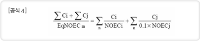 이 공식에서 Ci는 빠르게 분해되는 성분 i의 농도(중량 백분율)를, Cj는 빠르게 분해되지 않는 성분 j의 농도(중량 백분율)를, NOECi 는 빠르게 분해되는 성분 i의 NOEC 또는 ECx(㎎/L)를, NOECj 는 빠르게 분해되지 않는 성분 j의 NOEC 또는 ECx(㎎/L)를, 그리고 EqNOECm은 혼합물 중에서 시험 데이터가 있는 부분의 등가 NOEC를 의미 한다. - (c)성분의 합산방법 적용 : 혼합물 자체에 대한 분해성이나 생물 농축성 자료가 있을 수 없기 때문에 구성성분 또는 조합된 성분에 대한 독성 구분별로 함량을 고려하여 분류한다(표 4.1.2(b) 및 4.1.2(c) 참고)
